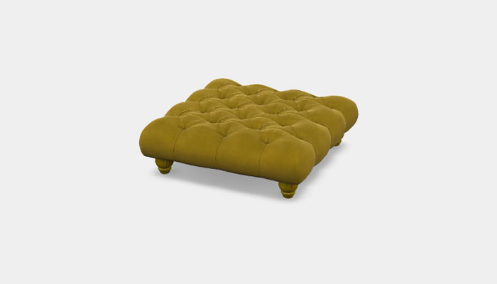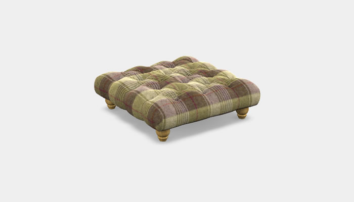 Wood Bros Fabric Footstool Square The Wood Bros Square Footstool is a soft and inviting square low footstool featuring turned wooden legs and a stylish diamond buttoned top. Available in an extensive range of beautiful fabrics, optional soft leather custom piping trim and legs in a selection of wood finishes.