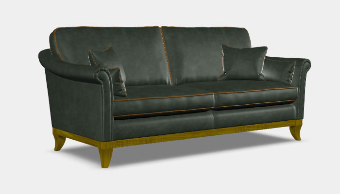 The Wood Bros Weybourne four seater large sofa features a tailored design, scroll arms and a wooden plinth. Available in a range of quality leathers, optional soft leather custom piping trim and legs in a selection of wood finishes.