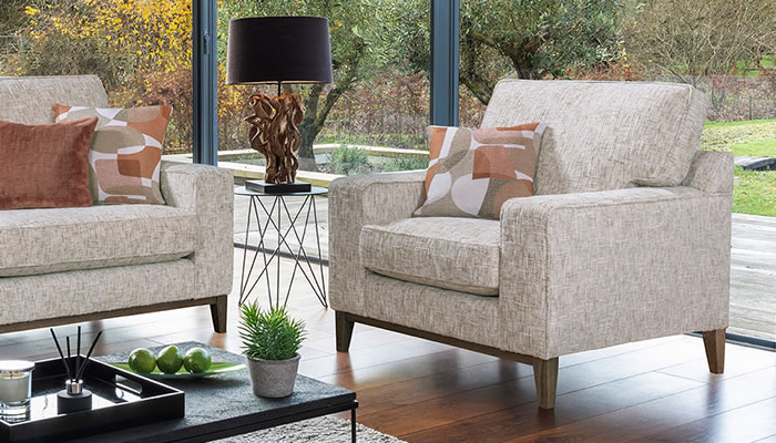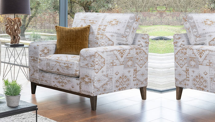 Alstons Fairmont Chair The Alstons Fairmont chair with a modern urban twist is available in a range of textured chenille plains mixed with geometric scatters and a choice of weathered or dark oak plinth and feet.