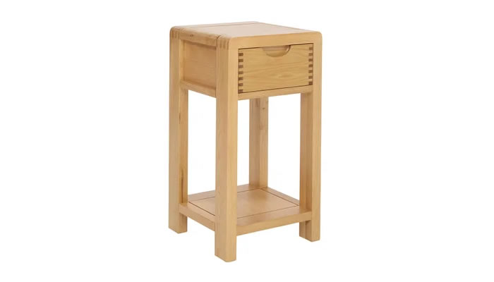 The ercol Bosco compact side table completes the collection, featuring the signature Bosco curved finger joint on the top corners and curved recessed drawer.