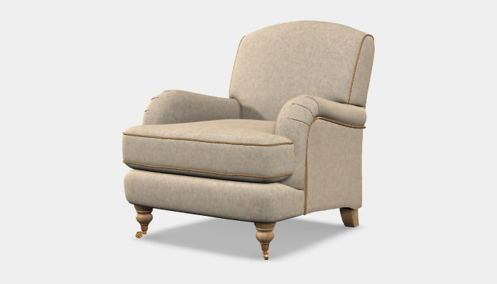 The Wood Bros Langton armchair is a delightful chair which features a traditional English roll arm shape and a relaxed and comfortable sit. Available in an extensive range of beautiful fabrics, optional soft leather custom piping trim and legs in a selection of wood finishes.