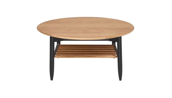 Ercol Monza Round Coffee Table The ercol Monza round coffee table is crafted from patina textured oak, the attractive design is contrasted by the circular top and the square underframe in contrasting black.