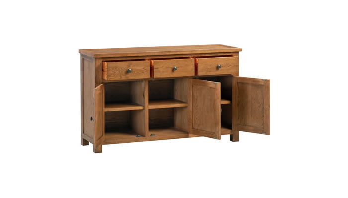 Dorridge Rustic Oak 3 Door Sideboard This Dorridge wide sideboard is perfect for when you need that extra bit of storage and surface area in your living space. This piece comes with three drawers and three cupboard sections, centre divided with an adjustable shelf in each cupboard. Finished in a protective light lacquer and a modern square metal knob.