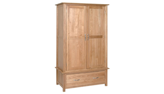 New York Bedroom Gents 1 Drawer Wardrobe This double wardrobe gives extra storage with the inclusion of a full length drawer at the base, perfect for shoes or foldable clothing. The contemporary New York Collection is sustainably sourced and uses traditional construction methods such as dovetailed drawers, tongue and groove backs and bases and brushed steel effect metal handles, finished in a protective light natural lacquer.
