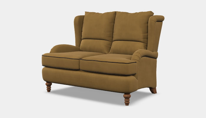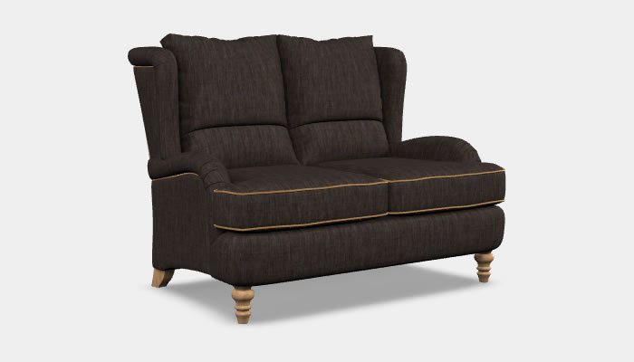 Wood Bros Bayford Compact 2 Seater Sofa The Wood Bros Bayford compact two seater sofa features lumber support, traditional English roll arm and a distinctive winged side profile. Available in an extensive range of beautiful fabrics, optional soft leather custom piping trim and turned front legs in a selection of wood finishes.