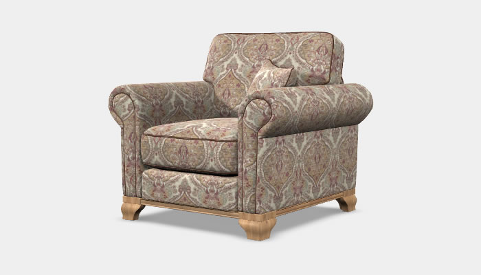The Wood Bros Lavenham armchair is a traditional style chair which features generous scroll arms and a wooden plinth. Available in an extensive range of beautiful fabrics, optional soft leather custom piping trim and legs in a selection of wood finishes.