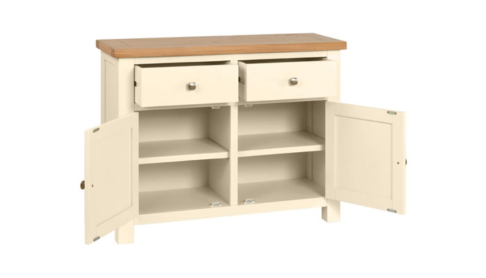 Digbeth Painted 2 Door Sideboard This standard size 2 door sideboard is perfect for extra storage and surface area in your living space. Clean straight lines with stylish panels and dovetailed drawers crafted from white oak, pine and MDF. Available in Ivory, White and Moon Grey.