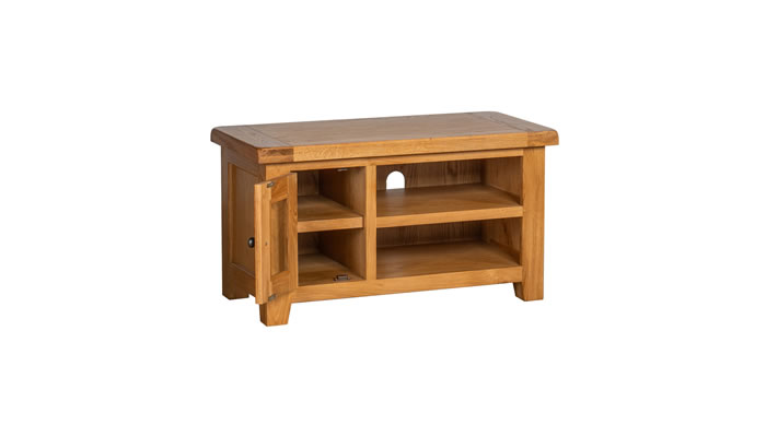 This Signature Collection Southam traditional style Small TV Unit is the perfect media station. A cupboard for storage and a larger open section for your consoles and entertainment boxes. Constructed from white oak, chunky top with softened corners, tapered legs, dovetailed drawers and supplied with a rustic round metal knob on the door and a hole for wires in the back. Finished in a modern attractive wax.